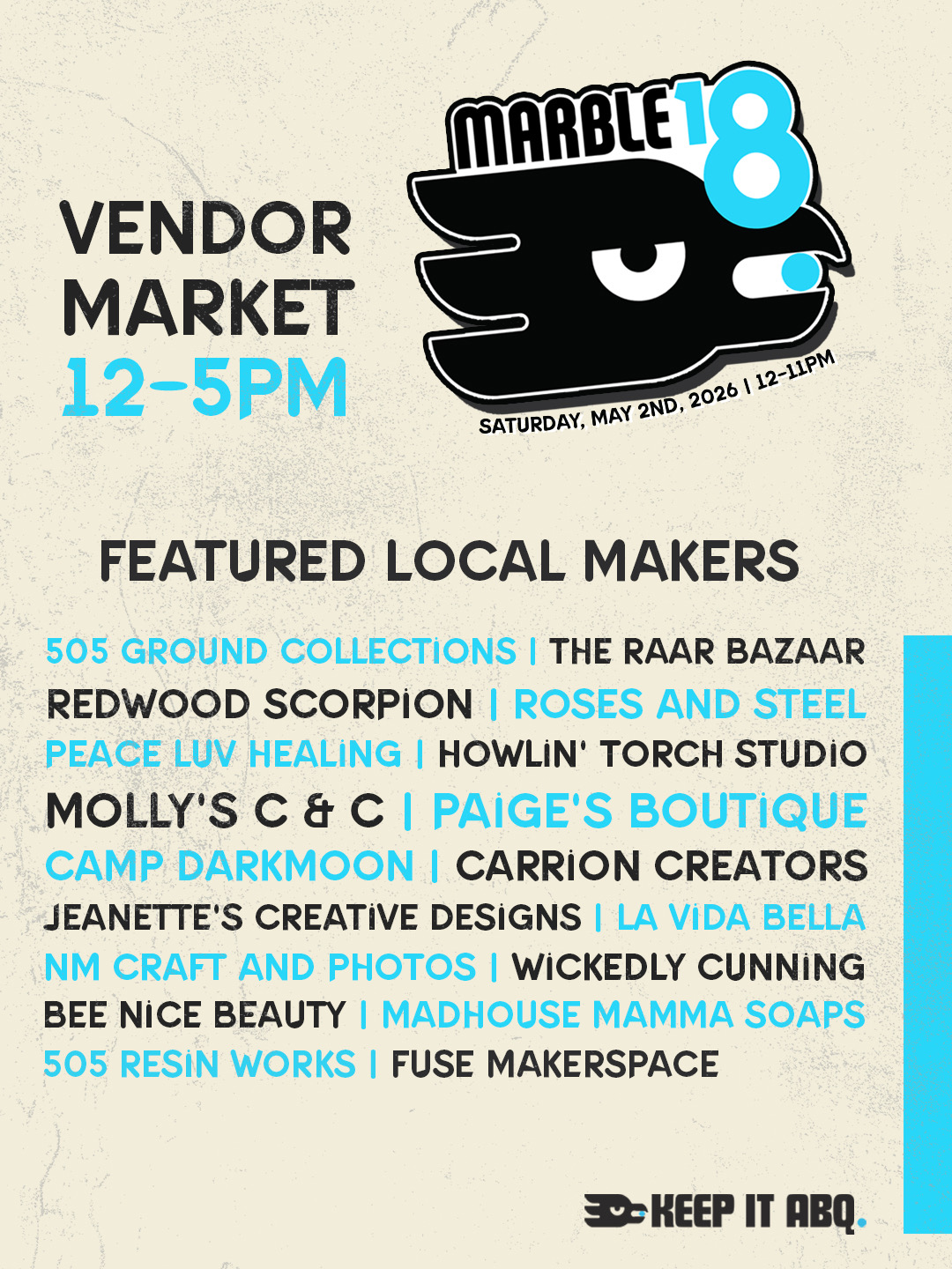 We’re donating 50% of admission fees to local non-profits through our Keep It ABQ initiative. Let’s celebrate 18 years of Marble on Sat, May 2nd at One Eleven Bar & Venue and support the community efforts of Off Center Arts Project & WESST New Mexico. Live music from the Red Light Cameras and more, local vendors, food, and plenty of cold beer to go around. $10 admission